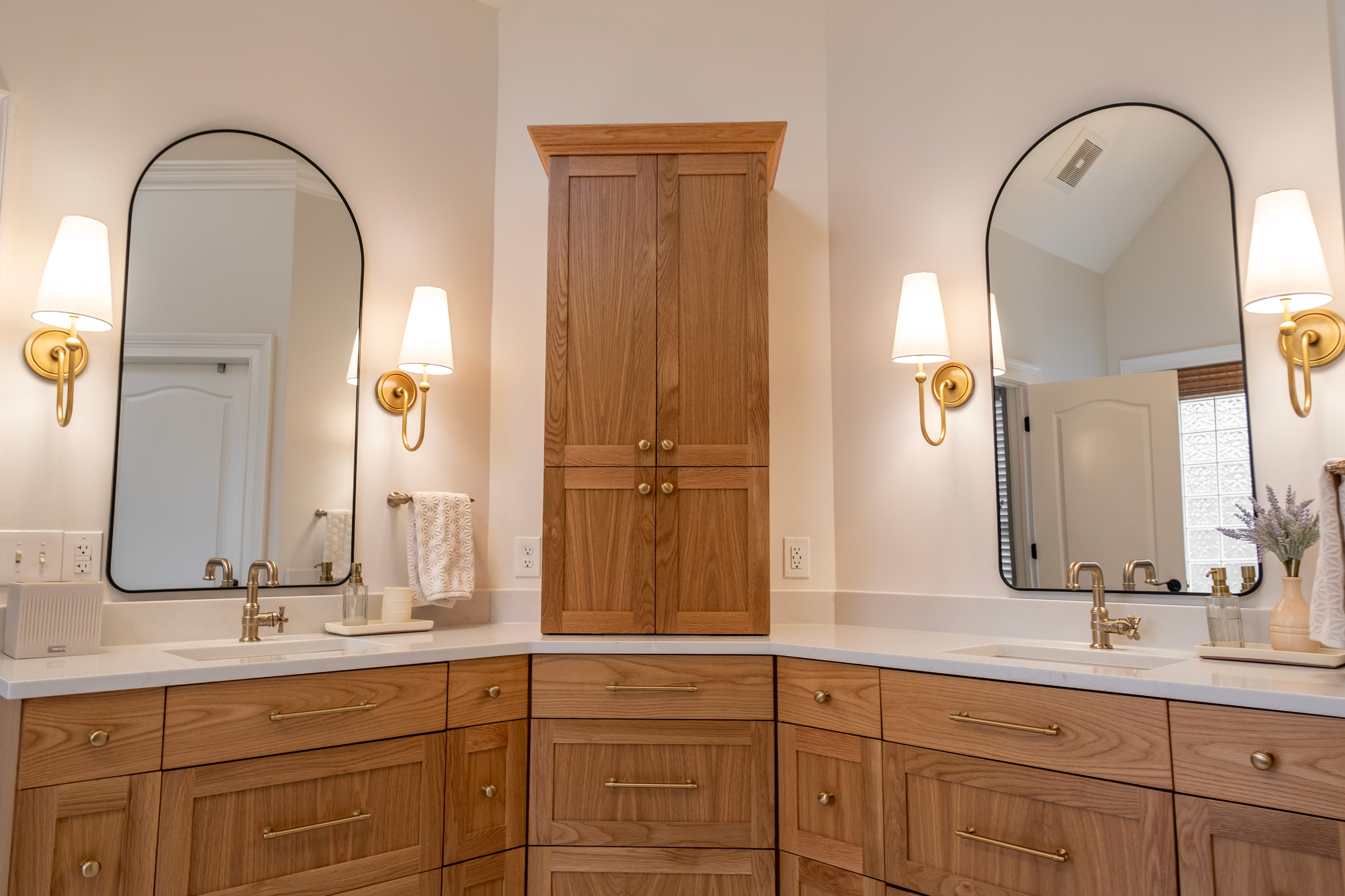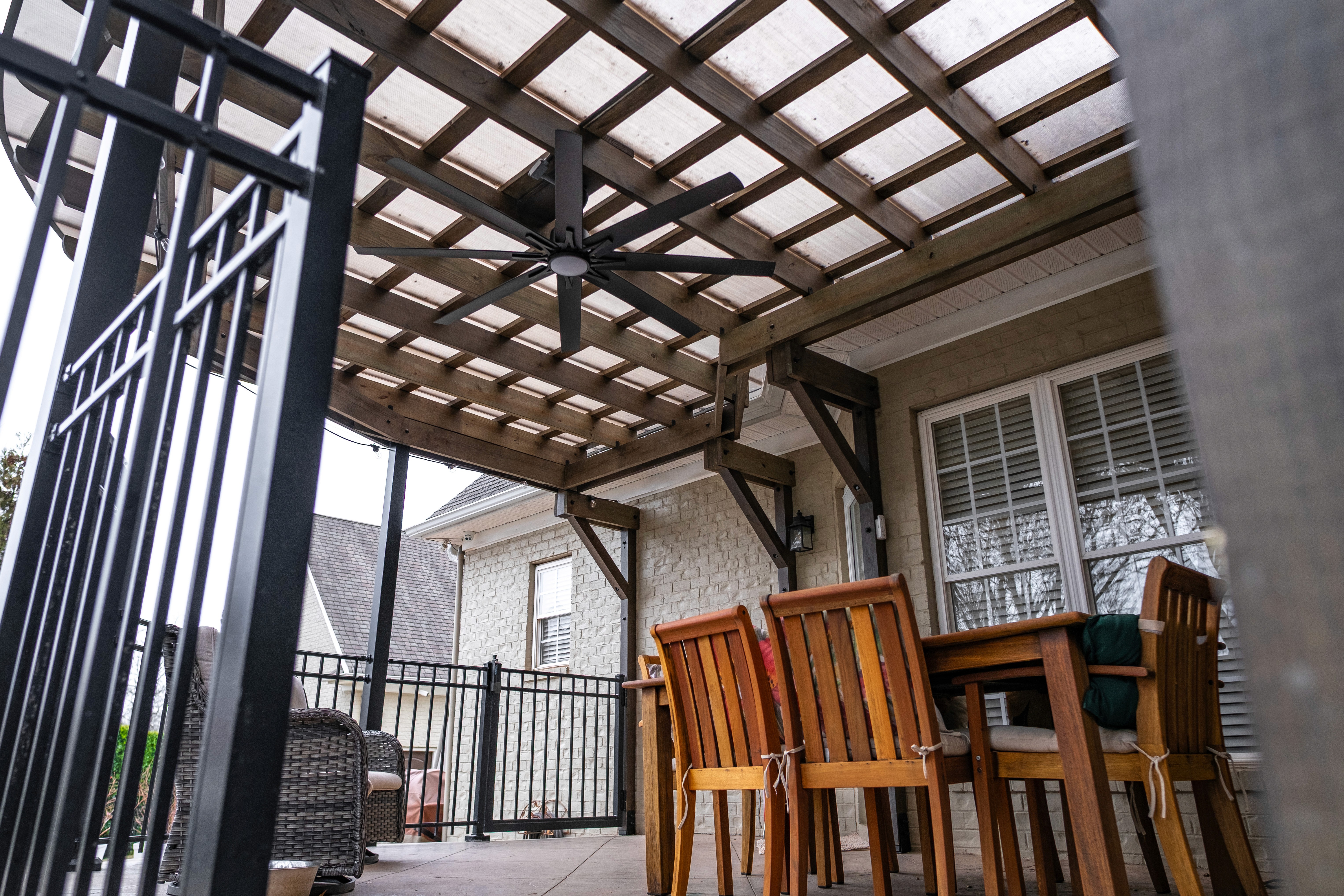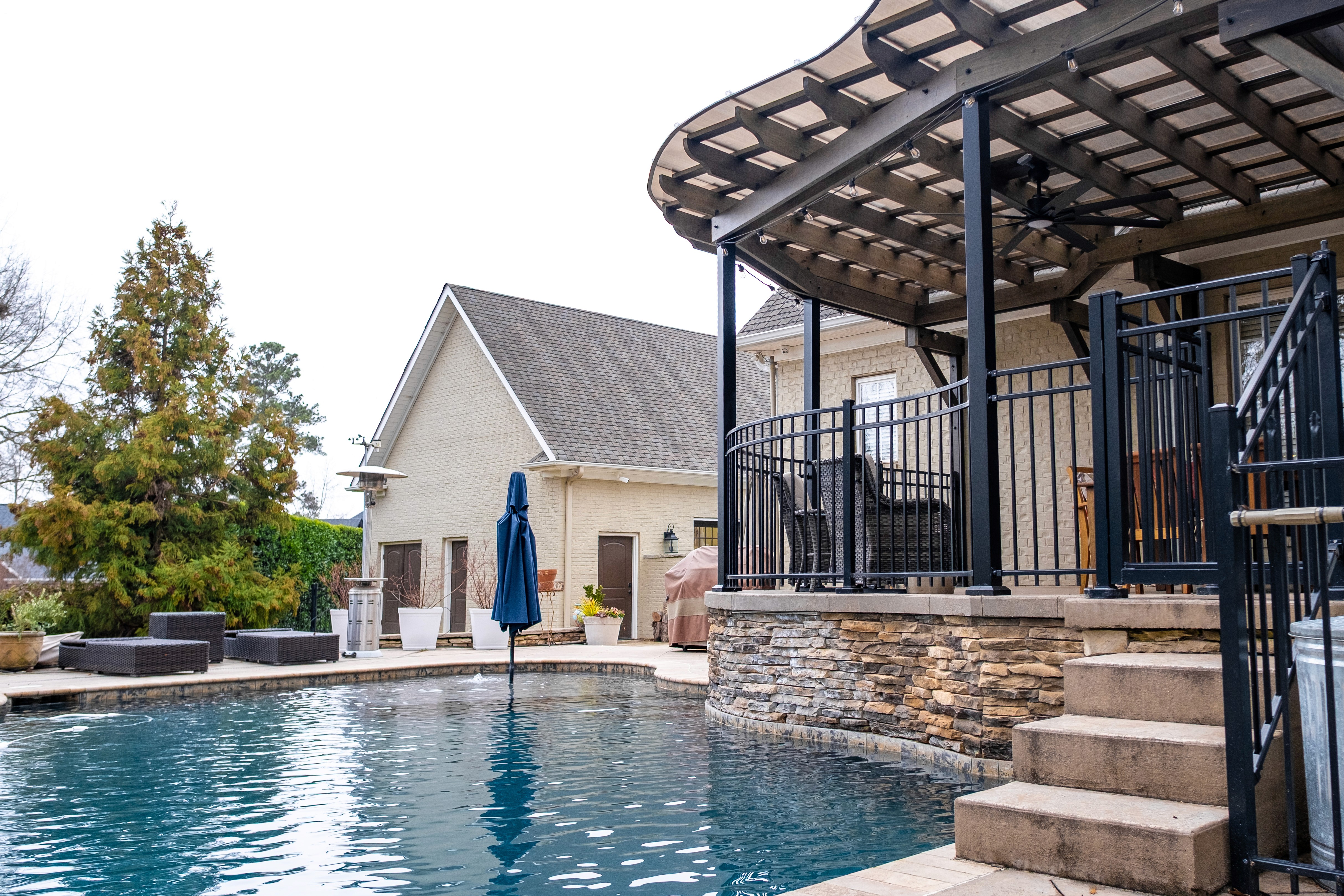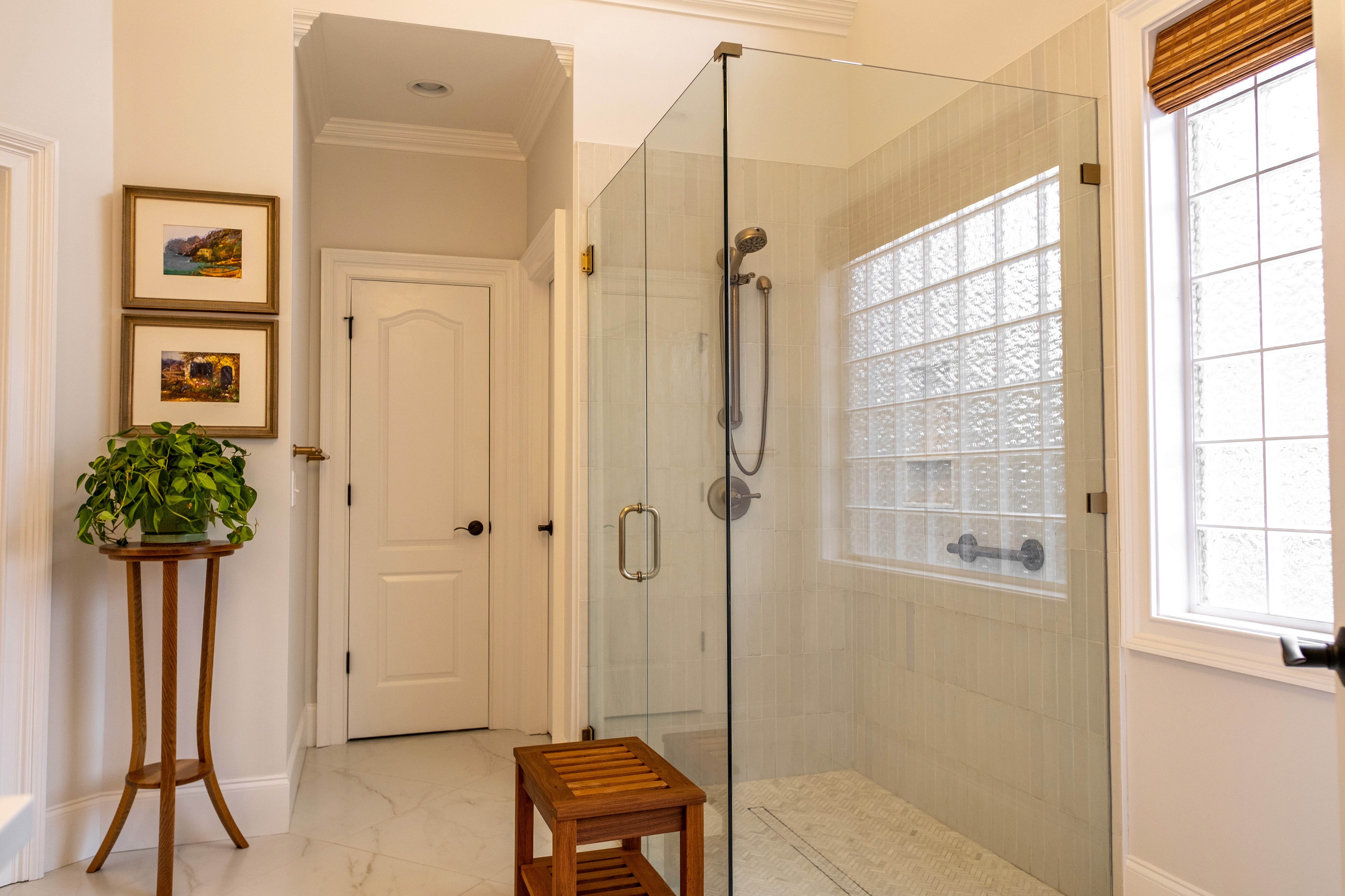 The custom pergola and master bathroom at Providence Way were designed where luxury meets functionality. Spacious designs, thoughtful storage solutions, heated floors, and a zero-entry shower are just a few details that work together to create a timeless space that supports comfort, accessibility, and long-term living.